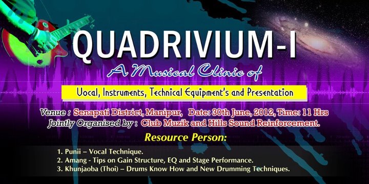 Club Muzik and Hills Sound Reinforcement will organize a one day musical clinic called QUADRIVIUM on the 30th of June, 2012 at Senapati, Manipur. The workshop is a part of the Club Muzik's venture to promote and uplift the local musicians and artist to strive to the present competitive scenario […]